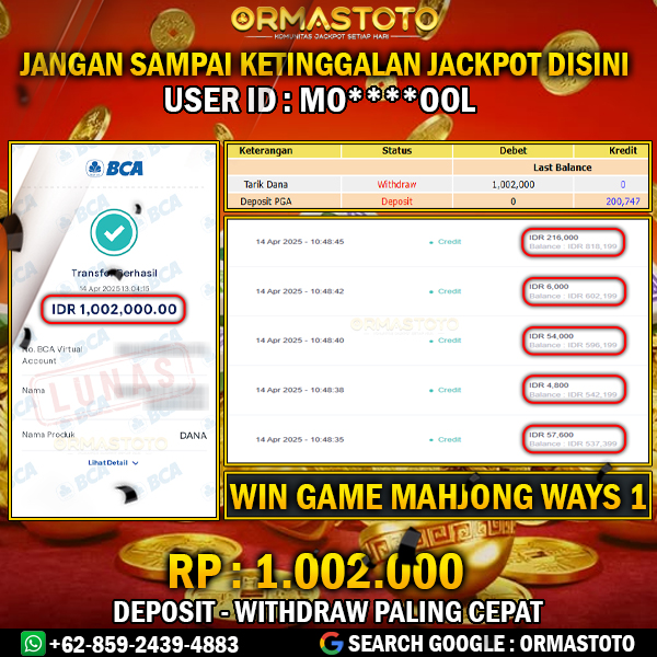 BUKTI JACKPOT WEDE MENANG DIGAME MAHJONG WAYS 2 RP 1,000,000 SUDAH DI TRANSFER LUNAS ormastoto, 10 April 2025 MENANG DIGAME MAHJONG WAYS 2 RP 1,000,000 SUDAH DI TRANSFER LUNAS Selamat kepada User id : H**I Telah berhasil mendapatkan kemenangan besar pada permainan SLOT MAHJONG WAYS 2 (PG SOFT) kemenangan Sebesar Rp 1.000.000 Setelah mengisi formulir withdraw dengan kurung waktu hanya 5 – 10 menit pihak Ormastoto sudah melakukan transfer kepada pemilik Userid dan dana sudah… Continue Reading