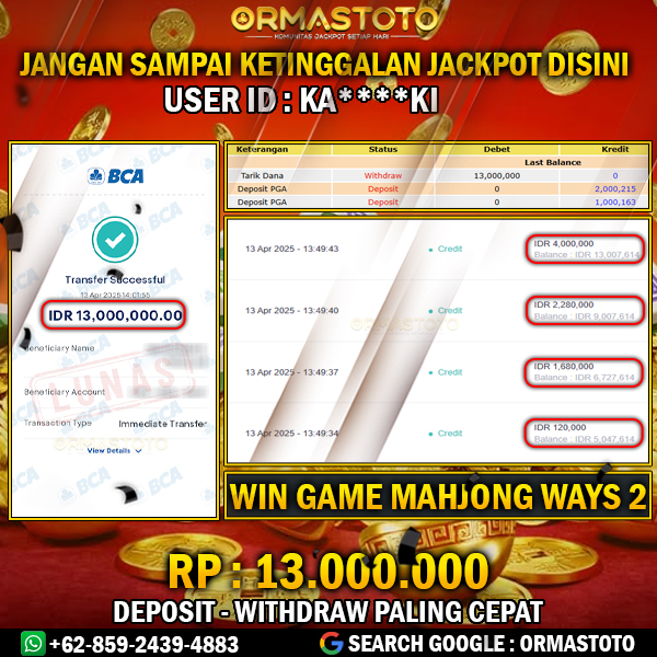 BUKTI JACKPOT WEDE MENANG BESAR DI GAME MAHJONG WAYS 2 RP 13,000,000 SUDAH TERBAYAR LUNAS ormastoto, 15 April 202515 April 2025 MENANG BESAR DI GAME MAHJONG WAYS 2 RP 13,000,000 SUDAH TERBAYAR LUNAS Selamat kepada User id : KA****KI Telah berhasil mendapatkan kemenangan besar pada permainan SLOT MAHJONG WAYS 2 (PG SOFT) kemenangan Sebesar Rp 13.000.000 Setelah mengisi formulir withdraw dengan kurung waktu hanya 5 – 10 menit pihak Ormastoto sudah melakukan transfer kepada pemilik Userid dan dana… Continue Reading