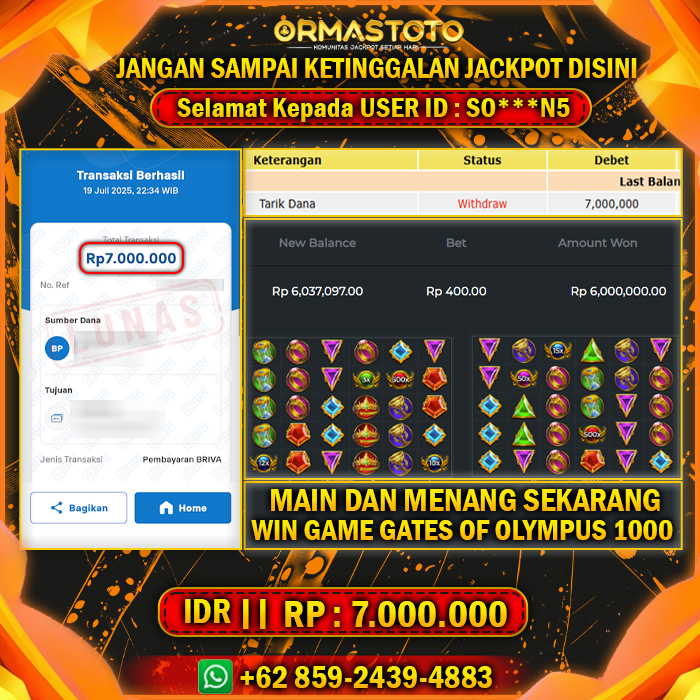 BUKTI JACKPOT WEDE NEW ACCOUNT BERHASIL WD 7JUTA MAIN OLYMPUS 1000 KESAMBAR PETIR X500++ LANGSUNG CAIR BOSSKU HANYA DI ORMASTOTO ormastoto, 20 Juli 2025 NEW ACCOUNT BERHASIL WD 7JUTA MAIN OLYMPUS 1000 KESAMBAR PETIR X500++ LANGSUNG CAIR BOSSKU HANYA DI ORMASTOTO Selamat kepada User id : SO****N5 Telah berhasil mendapatkan kemenangan besar pada permainan SLOT GATES OF OLYMPUS 1000 (PRAGMATIG) kemenangan Sebesar Rp 7.000.000 Setelah mengisi formulir withdraw dengan kurung waktu hanya 5 – 10 menit pihak Ormastoto sudah melakukan transfer kepada… Continue Reading