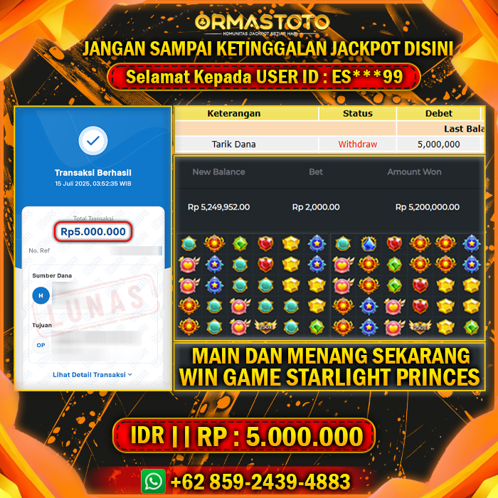 BUKTI JACKPOT WEDE MENANG BESAR DI GAME STARLIGHT PRINCES STAKE 2K BISA WD 5JUTA ormastoto, 15 Juli 2025 MENANG BESAR DI GAME STARLIGHT PRINCES STAKE 2K BISA WD 5JUTA Selamat kepada User id : ES****99 Telah berhasil mendapatkan kemenangan besar pada permainan SLOT STARLIGHT PRINCES (PRAGMATIG) kemenangan Sebesar Rp 5.000.000 Setelah mengisi formulir withdraw dengan kurung waktu hanya 5 – 10 menit pihak Ormastoto sudah melakukan transfer kepada pemilik Userid dan dana sudah dapat di cairkan… Continue Reading