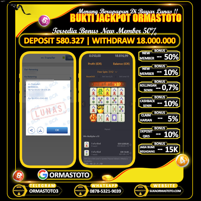Uncategorized ORMASTOTO : Cuan Main Digame Mahjong Ways Bikin Betah Ngeslot ormastoto, 18 Desember 2025 Kemenangan besar kembali terjadi di ORMASTOTO! Seorang member berhasil membuktikan bahwa situs ini benar-benar membayar berapapun kemenangan tanpa drama!Dengan deposit hanya Rp580.327, pemain tersebut sukses melakukan withdraw Rp18.000.000, dan transaksi langsung berhasil dengan status LUNAS! Bukti Pembayaran Asli & Terverifikasi Pada gambar di atas terlihat jelas, transfer senilai Rp18.000.000 berhasil… Continue Reading