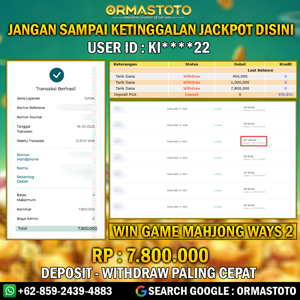 BUKTI JACKPOT WEDE MENANG DI GAME MAHJONG WAYS 2 SEBESAR RP : 7,800,000,- LUNAS ormastoto, 22 Maret 202522 Maret 2025 ✨MENANG DI GAME MAHJONG WAYS 2 SEBESAR RP : 7,800,000,- LUNAS✨ Selamat kepada User id : KI***22 Telah berhasil mendapatkan kemenangan besar pada permainan SLOT MAHJONG WAYS 2 kemenangan Sebesar Rp.7.800.000, Setelah mengisi formulir withdraw dengan kurung waktu hanya 5 – 10 menit pihak Ormastoto sudah melakukan transfer kepada pemilik… Continue Reading