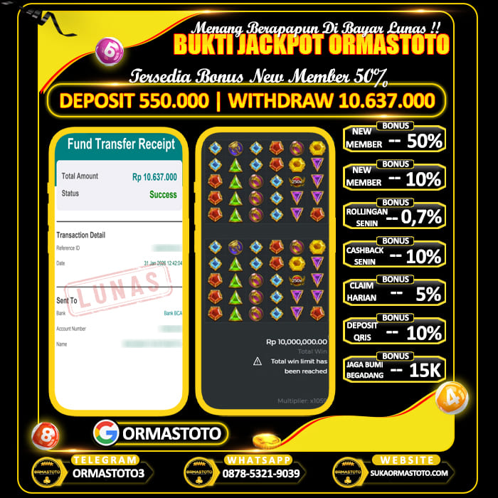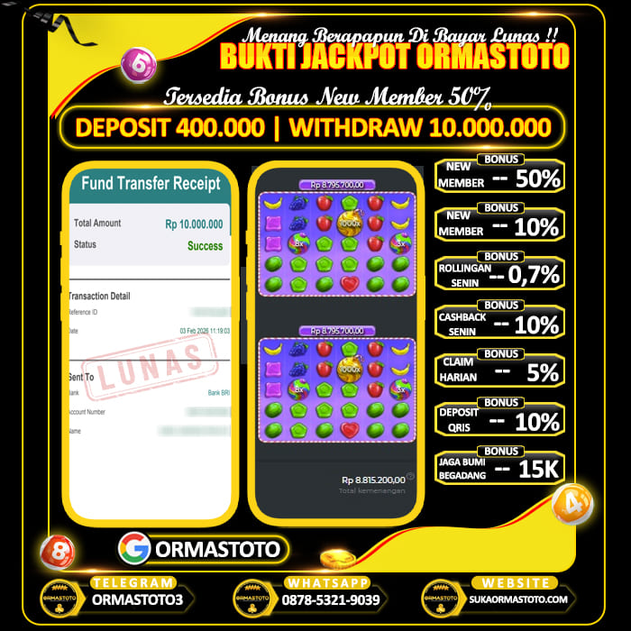 Uncategorized ORMASTOTO | Main Digame Bonanza X1000 Cuan Sampai Rp10.000.000 ormastoto, 3 Februari 2026 Kemenangan besar kembali terjadi di ORMASTOTO! Seorang member berhasil membuktikan bahwa situs ini benar-benar membayar berapapun kemenangan tanpa drama!Dengan deposit hanya Rp400,000, pemain tersebut sukses melakukan withdraw Rp10,000,000, dan transaksi langsung berhasil dengan status LUNAS! Bukti Pembayaran Asli & Terverifikasi Pada gambar di atas terlihat jelas, transfer senilai Rp10,000,000 berhasil… Continue Reading