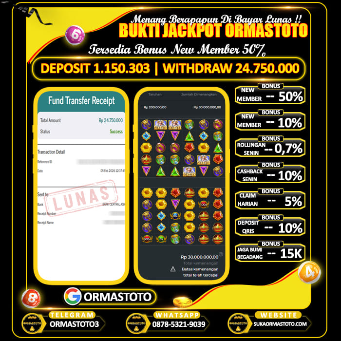 Uncategorized ORMASTOTO | Akses Link Jackpot Bermain Gates Of Olympus 1000 ormastoto, 5 Februari 2026 Kemenangan besar kembali terjadi di ORMASTOTO! Seorang member berhasil membuktikan bahwa situs ini benar-benar membayar berapapun kemenangan tanpa drama!Dengan deposit hanya Rp1,150,303, pemain tersebut sukses melakukan withdraw Rp24,750,000, dan transaksi langsung berhasil dengan status LUNAS! Bukti Pembayaran Asli & Terverifikasi Pada gambar di atas terlihat jelas, transfer senilai Rp24,750,000 berhasil… Continue Reading