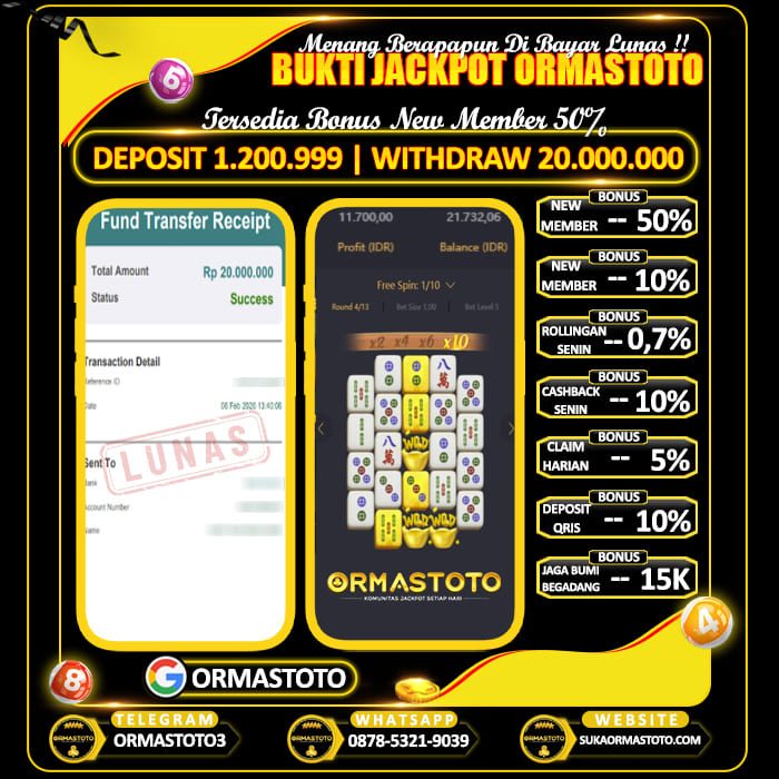 Uncategorized ORMASTOTO | Game Slot Mahjong Ways Slalu Kasih Kejutan Hingga Rp20.000.000 ormastoto, 6 Februari 2026 Kemenangan besar kembali terjadi di ORMASTOTO! Seorang member berhasil membuktikan bahwa situs ini benar-benar membayar berapapun kemenangan tanpa drama!Dengan deposit hanya Rp1,200,999, pemain tersebut sukses melakukan withdraw Rp20,000,000, dan transaksi langsung berhasil dengan status LUNAS! Bukti Pembayaran Asli & Terverifikasi Pada gambar di atas terlihat jelas, transfer senilai Rp20,000,000 berhasil… Continue Reading