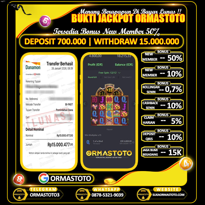 Uncategorized ORMASTOTO : Cair Dari Wild Bandito Jackpot Rp15.000.000 ormastoto, 26 Januari 2026 Kemenangan besar kembali terjadi di ORMASTOTO! Seorang member berhasil membuktikan bahwa situs ini benar-benar membayar berapapun kemenangan tanpa drama!Dengan deposit hanya Rp700,000, pemain tersebut sukses melakukan withdraw Rp15,000,000, dan transaksi langsung berhasil dengan status LUNAS! Bukti Pembayaran Asli & Terverifikasi Pada gambar di atas terlihat jelas, transfer senilai Rp15,000,000 berhasil… Continue Reading