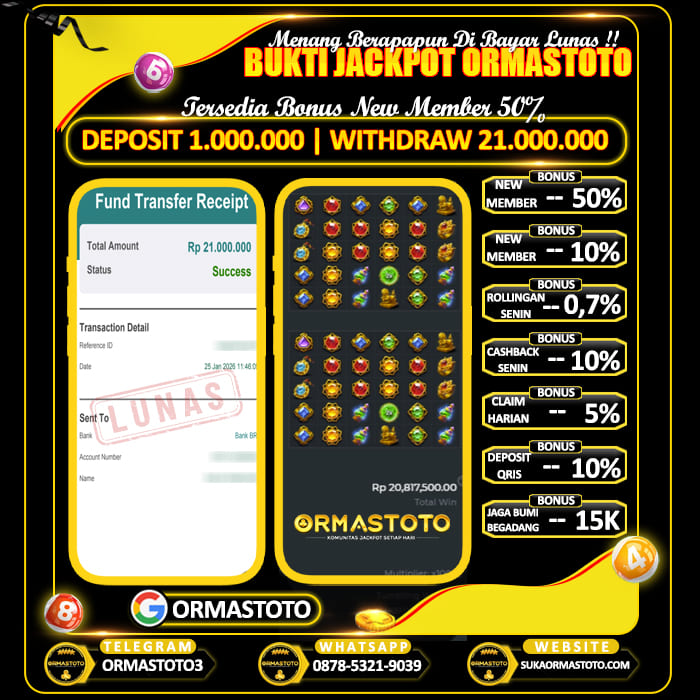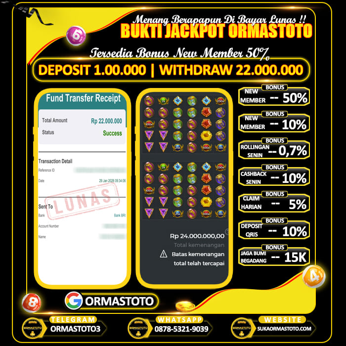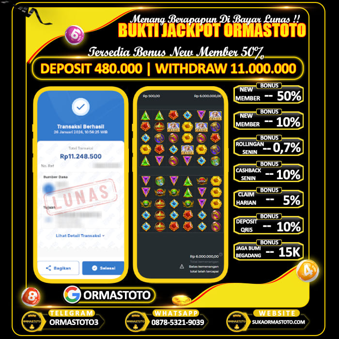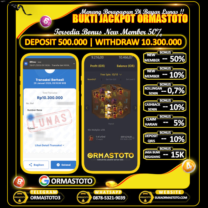 Uncategorized ORMASTOTO : Tanpa Pola Tetap Cuan Digame Wild Bounty Cair Rp10.300.000 ormastoto, 28 Januari 2026 Kemenangan besar kembali terjadi di ORMASTOTO! Seorang member berhasil membuktikan bahwa situs ini benar-benar membayar berapapun kemenangan tanpa drama!Dengan deposit hanya Rp500,000, pemain tersebut sukses melakukan withdraw Rp10,300,000, dan transaksi langsung berhasil dengan status LUNAS! Bukti Pembayaran Asli & Terverifikasi Pada gambar di atas terlihat jelas, transfer senilai Rp10,300,000 berhasil… Continue Reading
