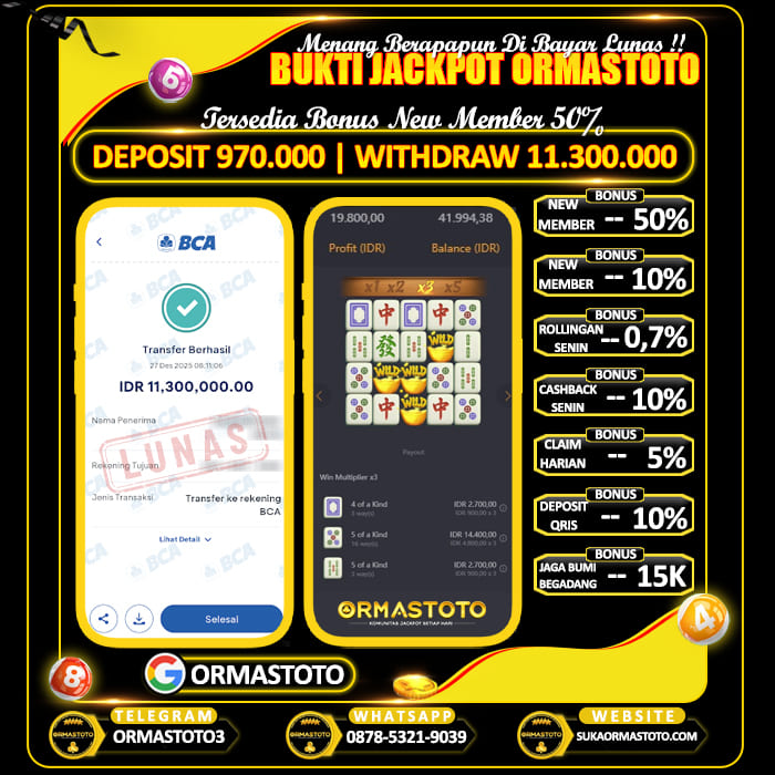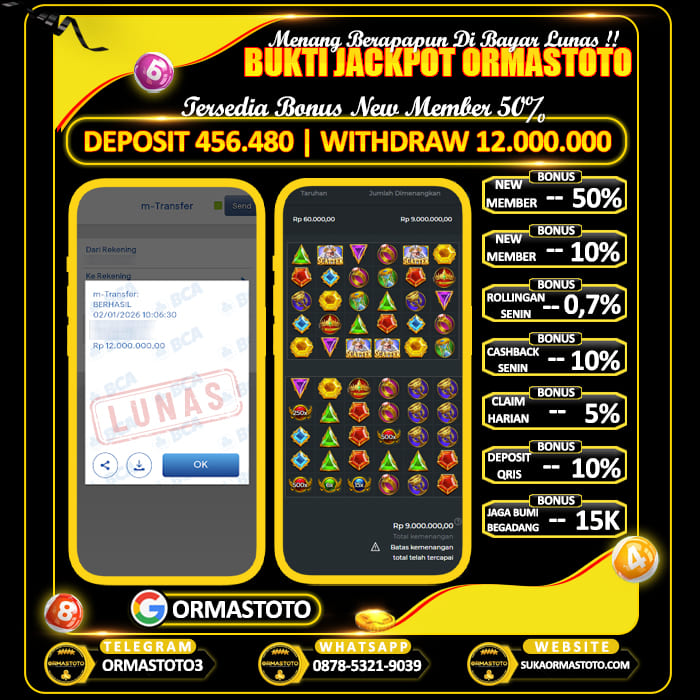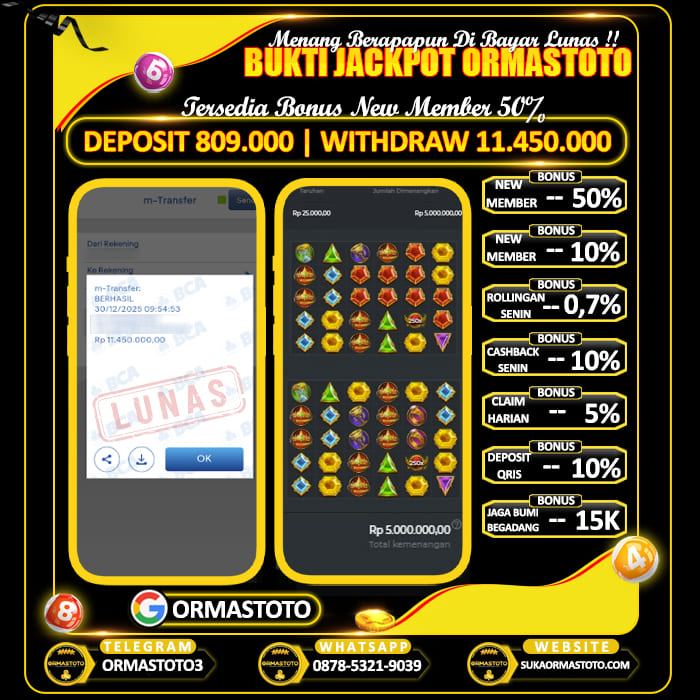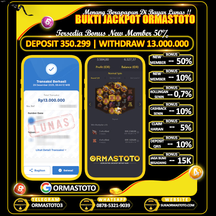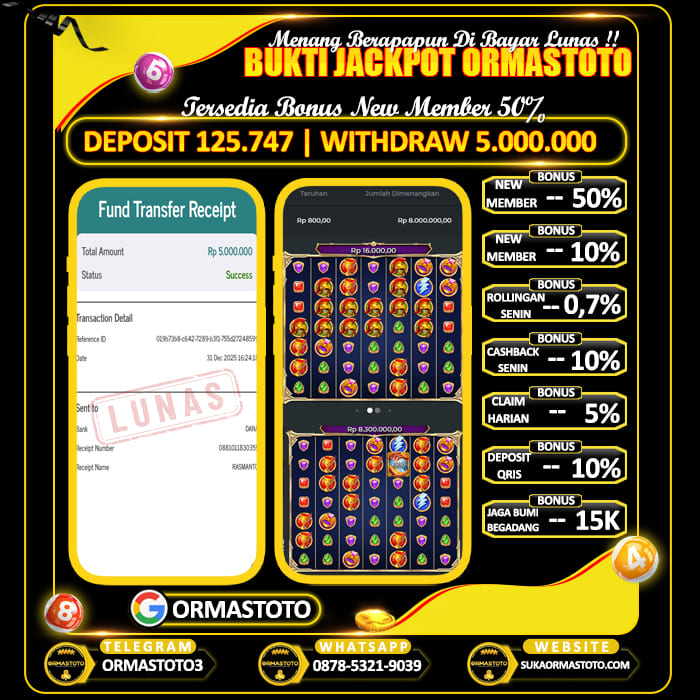 Uncategorized ORMASTOTO : Dikasih Jajan Malam Tahun Baru Cuma Mudah Receh Disini ormastoto, 31 Desember 2025 Kemenangan besar kembali terjadi di ORMASTOTO! Seorang member berhasil membuktikan bahwa situs ini benar-benar membayar berapapun kemenangan tanpa drama!Dengan deposit hanya Rp125.747, pemain tersebut sukses melakukan withdraw Rp5.000.000, dan transaksi langsung berhasil dengan status LUNAS! Bukti Pembayaran Asli & Terverifikasi Pada gambar di atas terlihat jelas, transfer senilai Rp5.000.000 berhasil… Continue Reading