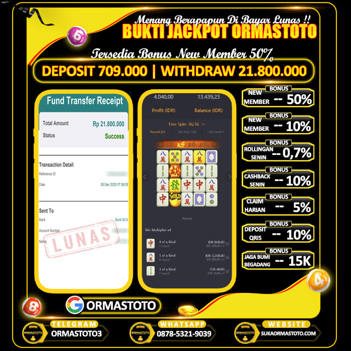 Uncategorized ORMASTOTO : Cuan Terus Jalan Kalau Main Disini ormastoto, 28 Desember 2025 Kemenangan besar kembali terjadi di ORMASTOTO! Seorang member berhasil membuktikan bahwa situs ini benar-benar membayar berapapun kemenangan tanpa drama!Dengan deposit hanya Rp709.000, pemain tersebut sukses melakukan withdraw Rp21.800.000, dan transaksi langsung berhasil dengan status LUNAS! Bukti Pembayaran Asli & Terverifikasi Pada gambar di atas terlihat jelas, transfer senilai Rp21.800.000 berhasil… Continue Reading