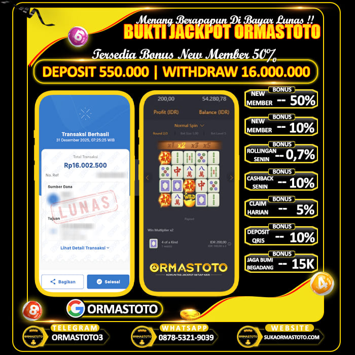 Uncategorized ORMASTOTO : Cair Dari Game Mahjong Ways Bosku! ormastoto, 31 Desember 2025 Kemenangan besar kembali terjadi di ORMASTOTO! Seorang member berhasil membuktikan bahwa situs ini benar-benar membayar berapapun kemenangan tanpa drama!Dengan deposit hanya Rp550,000, pemain tersebut sukses melakukan withdraw Rp16.000.000, dan transaksi langsung berhasil dengan status LUNAS! Bukti Pembayaran Asli & Terverifikasi Pada gambar di atas terlihat jelas, transfer senilai Rp16.000.000 berhasil… Continue Reading